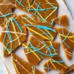The image shows several pieces of brown brittle candy broken into irregular shapes arranged flat over a white marbled surface covered with parchment paper. Each candy piece is thin and smooth with a shiny texture. The brittle is decorated by colorful blue, yellow, and light green icing drizzled in thin, wavy lines across the surface of the candy pieces, creating a playful contrast with the golden brown candy. The pieces are scattered casually but closely together. Photo taken with an iphone --ar 4:5 --v 7