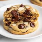A close-up view of a small stack of chocolate chip cookies on a white plate, with one cookie broken in half leaning against the others. The cookies are light golden brown with a soft, slightly crumbly texture. Dark chocolate chips and sliced almonds are scattered throughout the cookies, some melted and some whole, adding a mix of smooth and crunchy textures. The background shows a white marbled surface softly blurred. photo taken with an iphone --ar 4:5 --v 7