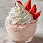 A glass bowl filled with a soft, light pink creamy mixture with visible small red strawberry pieces, topped with a thick swirl of white whipped cream. Two bright red, fresh strawberry halves are placed upright at the back edge of the whipped cream, adding a pop of color. The bowl is placed on a white marbled surface with a blurred neutral background, giving focus to the creamy dessert. photo taken with an iphone --ar 4:5 --v 7
