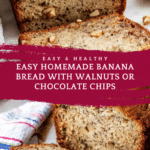 Keywords: banana bread, easy banana bread, homemade banana bread, ripe banana recipe, walnut banana bread, chocolate chip banana bread, quick bread
