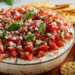 This Bruschetta Dip is a vibrant and flavorful appetizer featuring a fresh tomato and basil bruschetta topping layered over a creamy feta and cream cheese base. It offers a perfect balance of tangy, savory, and aromatic notes, making it an ideal party dip that delights with every bite.
