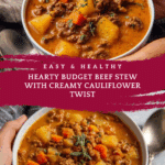Keywords: beef stew, budget recipe, ground beef, cauliflower puree, comfort food, easy dinner, one pot meal, frozen peas, healthy stew