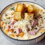 - Season and Serve: Taste the soup and adjust seasoning with salt and pepper if needed. Ladle the soup into bowls and garnish with shredded Swiss cheese and croutons. Serve immediately and enjoy your comforting Chicken Cordon Bleu Soup.