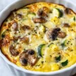 A white shallow round dish filled with a baked egg casserole showing two visible layers: the bottom layer has a smooth yellow egg base, and the top layer is a melted, slightly browned cheese with scattered pieces of cooked brown mushrooms and green zucchini slices, all mixed with small bits of yellow squash. The surface shows a bubbly, golden texture with light herbs sprinkled. The background features a white marbled texture. photo taken with an iphone --ar 4:5 --v 7