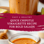 This chipotle vinaigrette recipe is a bold, smoky-sweet dressing inspired by Chipotle’s famous honey vinaigrette. Made quickly in just 5 minutes using chipotle peppers in adobo, honey, lime juice, and a blend of spices, it’s perfect for enhancing salads, burrito bowls, roasted vegetables, and easy meal prepping.