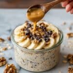 Chunky Monkey Overnight Oats is a delicious and nutritious no-cook breakfast recipe featuring creamy oats soaked overnight with milk, Greek yogurt, peanut butter, banana, and chocolate chips. This easy, make-ahead meal is perfect for busy mornings, combining the creamy texture of soaked oats with the rich flavors of peanut butter and chocolate, balanced by fresh banana slices and crunchy walnuts. It’s a healthy treat that feels like dessert in a jar.