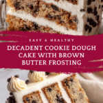 Keywords: Cookie dough cake, brown butter cake, edible cookie dough, brown butter frosting, chocolate chip cake, homemade celebration cake