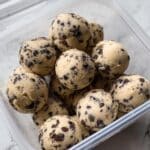 The image shows several small, round dough balls inside a clear plastic container. Each ball is beige with many small, dark chocolate chunks mixed throughout, giving a speckled look. The texture of the dough appears soft and slightly crumbly. The container is set on a white marbled surface, and the balls are closely packed, filling the container. photo taken with an iphone --ar 4:5 --v 7