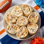A large white plate filled with about six layers of small tortilla pinwheels arranged closely together. Each pinwheel is cream-colored with visible bits of orange cheese, green herbs, and red pieces inside, showing a textured and colorful filling. The plate has a blue and orange striped napkin underneath, all set on a white marbled surface decorated with football-themed items like a football-shaped plate and small pom-poms in orange and blue colors. Photo taken with an iphone --ar 4:5 --v 7