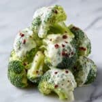 The image shows broccoli florets coated in a creamy white sauce with small red chili flakes sprinkled on top, arranged in a loose pile. The bright green of the broccoli contrasts with the smooth, pale sauce that covers each piece unevenly, giving a slightly chunky texture where the sauce clings. The broccoli sits directly on a white marbled surface with no visible bowl or plate beneath. The lighting highlights the freshness and the texture of the creamy sauce on the broccoli. photo taken with an iphone --ar 4:5 --v 7
