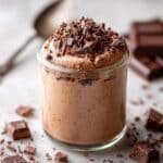 A clear glass jar filled with a thick, smooth chocolate mousse that has a light brown, airy texture, slightly overflowing at the top with soft peaks. The mousse is layered once inside the jar. On top, there is a generous pile of dark chocolate chunks and small chocolate sprinkles, adding a rough texture and darker color contrast. The jar sits on a white marbled surface with scattered chocolate bits around it, and in the background, blurred dark chocolate squares and a spoon held by a woman's hand appear. photo taken with an iphone --ar 4:5 --v 7