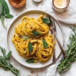 - Serve: Transfer the coated pasta to serving plates. Garnish with fresh sage leaves, grated vegan parmesan, and a sprinkle of freshly ground pepper. Serve immediately and enjoy.