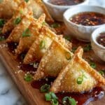- Make sure the oil is sufficiently hot before frying to avoid soggy wonton wrappers.