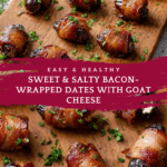 These Dates with Goat Cheese Wrapped in Bacon are a perfect balance of sweet and salty flavors, making an irresistible appetizer. Soft dates stuffed with creamy goat cheese, wrapped in crispy bacon, then drizzled with honey and garnished with fresh herbs create an elegant and easy-to-make dish ideal for parties or special occasions.