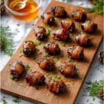 These Dates with Goat Cheese Wrapped in Bacon are a perfect balance of sweet and salty flavors, making an irresistible appetizer. Soft dates stuffed with creamy goat cheese, wrapped in crispy bacon, then drizzled with honey and garnished with fresh herbs create an elegant and easy-to-make dish ideal for parties or special occasions.