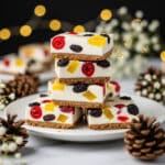 The image shows a stack of four square white dessert bars on a white plate. Each bar has a thick white layer packed with colorful dried fruit pieces like red cherries, yellow pineapple, and dark raisins, all embedded in a smooth white base. Underneath this fruit-packed layer is a thin, rich brown crust with a crumbly texture. The stack sits on a white marbled surface, surrounded by pinecones and small white flowers in soft focus, with warm blurred lights in the dark background. photo taken with an iphone --ar 4:5 --v 7