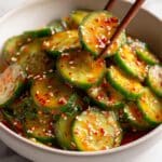 Keywords: Asian cucumber salad, easy cucumber salad, no-cook salad, refreshing side dish, spicy cucumber salad, sesame cucumber salad