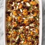 The image shows a single-layer dish inside a white rectangular baking dish filled with a mix of rice, small cooked shrimp, chopped nuts, and dried cranberries. The rice is light brown with visible herbs sprinkled throughout, giving a speckled green color. Shrimp pieces have an orange-golden cooked look, scattered evenly on top and within the rice. White sliced almonds are sprinkled across the surface, along with pieces of chopped walnuts and some finely chopped green herbs. The mix has a textured, slightly glossy appearance suggesting it is well-cooked and moist. The background surface is white marble with veining. photo taken with an iphone --ar 4:5 --v 7