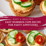 Keywords: hummus appetizer, mini hummus cups, pizza dough cups, party appetizers, Mediterranean dip, easy party snacks, vegetarian appetizers