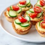A white plate holds several small tartlets, each with three layers: a golden-brown crispy crust at the bottom, a smooth pale yellow spread of hummus in the middle, and fresh green cucumber slices paired with bright red cherry tomato halves on the top. The tartlet edges are thick and slightly browned, giving a crunchy texture look, while the hummus layer is creamy. The cucumber slices are thin and have a glossy, fresh appearance, while the cherry tomatoes are vibrant and juicy, cut to show their seeds. The plate sits on a white marbled surface. photo taken with an iphone --ar 4:5 --v 7