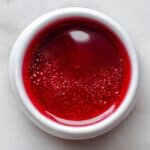 A close-up image of a small white bowl filled with shiny red sauce that looks smooth and slightly thick. The sauce surface reflects light and shows tiny bubbles with a glossy texture, covering the whole bowl evenly. The bowl sits on a white marbled surface. Photo taken with an iphone --ar 4:5 --v 7