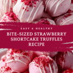 Keywords: Strawberry shortcake truffles, bite-sized dessert, cake truffles, strawberry frosting, candy coated truffles, party desserts, easy truffles