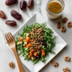 This Easy Vegan Lentil Salad is a flavorful, nutrient-packed dish perfect for a quick lunch or a healthy side. Featuring cooked lentils, shredded carrots, celery, fennel, dates, olives, and toasted walnuts, it’s tossed with a vibrant dressing of olive oil, garlic, lemon juice, balsamic vinegar, mustard, maple syrup, turmeric, and cinnamon. Serve it over massaged kale or arugula for an extra green boost. Ready in just 17 minutes, this salad stores well in the fridge for up to five days, making it ideal for meal prep.