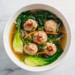 This Ginger Chicken Meatball Soup with Bok Choy is a comforting and flavorful Asian-inspired dish featuring tender chicken meatballs infused with fresh ginger and garlic. Baked to perfection and simmered in a savory broth with baby bok choy and optional noodles, it’s topped with crispy wonton strips for a delightful crunch. Perfect for a nourishing and satisfying meal ready in just 45 minutes.