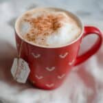 A red mug filled with a creamy drink that has a thick layer of white frothy foam on top, sprinkled lightly with brown cinnamon powder. The mug has a simple heart pattern near its rim and a string with a tea tag hanging from the handle. The mug is placed on a white marbled surface with a soft, blurred white cloth underneath, creating a cozy and warm feeling. Photo taken with an iphone --ar 4:5 --v 7