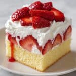 A single square piece of strawberry shortcake sits on a white plate, resting on a white marbled surface. The cake has three main layers: the bottom and top layers are light yellow sponge cake with a soft, fluffy texture, and between them is a thick layer of white whipped cream mixed with sliced strawberries. On top of the cake, there is a generous spread of whipped cream and several glossy red strawberry slices arranged closely together. Some strawberry syrup drips down the sides, adding a shiny, wet look to the dessert. Photo taken with an iphone --ar 4:5 --v 7
