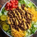 Keywords: cheeseburger salad, high protein salad, low carb burger bowl, gluten free burger, quick healthy dinner