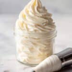 A small clear glass jar filled with creamy white frosting, layered and swirled thickly from the base to the top with visible soft ridges. The frosting has a smooth, slightly glossy texture and stands tall above the rim of the jar in a decorative, swirled peak. Next to the jar on the right side is a frosting piping bag with a metal tip, scarred slightly from use, resting on a white marbled surface. The background is softly blurred in light neutral tones to keep focus on the frosting and piping bag. photo taken with an iphone --ar 4:5 --v 7