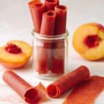 Store your homemade peach leather in an airtight container at room temperature. It will keep for up to 2 weeks. For longer storage, refrigerate or freeze the strips in sealed bags. To enjoy, simply remove and let come to room temperature. If the leather becomes sticky or soft, letting it rest uncovered for a short time can help restore the texture.