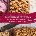 This Instant Pot Vegan Banana Bread is a moist, tender loaf packed with ripe bananas and topped with a crunchy walnut streusel. Made without eggs or dairy and using simple, wholesome ingredients, this recipe is the perfect quick bread for a healthy, delicious snack or breakfast. Cooked in an Instant Pot using steam pressure, it delivers excellent texture with minimal effort and no oven required.