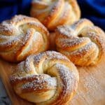 The image shows four golden brown twisted bread rolls on a light wooden board. Each roll has a soft, flaky texture with visible layers of dough twisted into a circular shape with a hole in the middle. The tops and sides of the rolls are sprinkled with powdered sugar, which also dusts the surface of the wooden board. The background features a deep blue cloth, and the scene is set on a white marbled texture. photo taken with an iphone --ar 4:5 --v 7