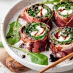Italian Sushi is a no-cook appetizer that features layers of prosciutto and Italian salami wrapped around fresh basil, arugula, sun-dried tomatoes, and creamy burrata. Drizzled with extra virgin olive oil and balsamic glaze, this elegant and flavorful dish combines Italian ingredients in a unique sushi-style roll, perfect for a quick and impressive starter.