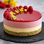 Keywords: mango mousse cake, raspberry mousse cake, pistachio cake, layered mousse cake, fruit mousse dessert