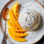 - Serve: Spoon about 1/3 cup of the coconut-infused sticky rice onto individual plates or bowls. Arrange sliced mango alongside or on top. Drizzle with additional coconut sauce and garnish with toasted sesame seeds if desired.