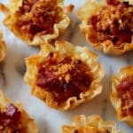 4. Bake to caramelize: Bake the filled phyllo cups for approximately 12-15 minutes, or until the cups are crisp, the bacon is caramelized and crisp, and the maple caramel is bubbly and golden. Once baked, allow them to cool for about 5 minutes before serving to let the caramel set slightly.