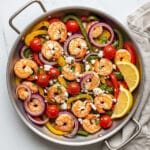 This Mediterranean Shrimp recipe is a quick and flavorful dish featuring sautéed shrimp with fresh vegetables, herbs, and a bright lemon finish. Perfect for a light yet satisfying meal, it combines juicy shrimp with cherry tomatoes, bell peppers, and red onion, seasoned with oregano and topped with fresh parsley and optional crumbled feta cheese.