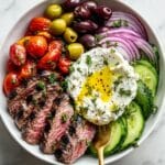 - Assemble Bowl: In individual bowls, layer cooked grains as the base. Top with sliced steak, cherry tomatoes, diced cucumber, sliced red onion, kalamata olives, roasted chickpeas if using, crumbled feta cheese, and chopped fresh herbs. Drizzle the lemon vinaigrette over the bowl and add dollops of chilled tzatziki sauce on top before serving.