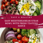 Keywords: Mediterranean steak bowl, sirloin steak recipe, healthy steak bowl, tzatziki sauce, lemon vinaigrette, grilled steak, healthy dinner, Mediterranean diet recipe