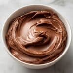 A white bowl filled with a thick layer of smooth, creamy chocolate frosting. The frosting has a rich brown color with soft, swirling textures on the surface, showing gentle peaks and waves. The bowl sits on a white marbled surface, and the lighting highlights the glossy, silky finish of the chocolate cream. photo taken with an iphone --ar 4:5 --v 7
