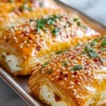 These oven baked feta rolls are crispy, flaky phyllo pastries filled with a creamy blend of feta, ricotta, and thyme, served with a sweet and spicy chili honey drizzle. Perfect as an elegant appetizer or party snack, they offer a delightful flavor contrast and satisfying texture with minimal preparation.