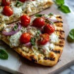 Pesto Chicken Flatbread with Mozzarella is a quick and delicious 20-minute meal perfect for dinner or as a flavorful appetizer. Featuring a crispy naan or flatbread base topped with fragrant basil pesto, tender cooked chicken, melted mozzarella cheese, fresh cherry tomatoes, and red onions, this recipe offers a delightful combination of textures and tastes. Garnished with fresh basil and optional red pepper flakes or balsamic glaze, it’s a simple yet impressive dish to serve any day of the week.