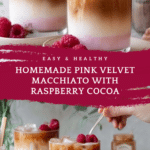 A delightful homemade Pink Velvet Macchiato featuring a naturally pink raspberry syrup with subtle notes of cocoa and cake batter, combined with creamy milk and rich chocolate raspberry espresso for a decadent coffee treat.