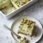 - Decorate and Chill: Spoon extra pistachio paste into a disposable piping bag or sandwich bag and pipe lines over the top layer of cream. Use a toothpick to drag through the piped lines in the opposite direction to create a feathered decorative pattern. Cover the dish with cling film and refrigerate for at least 4 hours, ideally overnight to allow the dessert to set and flavors to combine.