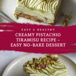 Keywords: Pistachio Tiramisu, Italian dessert, no bake tiramisu, mascarpone, pistachio cream, coffee soaked sponge fingers, layered dessert