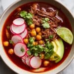 Pozole Rojo is a traditional Mexican hominy soup made with tender pork shoulder or chicken thighs simmered in a flavorful broth and enriched with a vibrant red chile sauce. This hearty soup is perfect for gatherings and festive occasions, offering comforting flavors with customizable garnishes like shredded cabbage, radishes, cilantro, lime, and jalapeños.