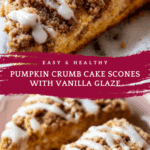 Keywords: pumpkin scones, crumb cake topping, fall recipe, pumpkin dessert, breakfast scones, vanilla glaze, spiced scones